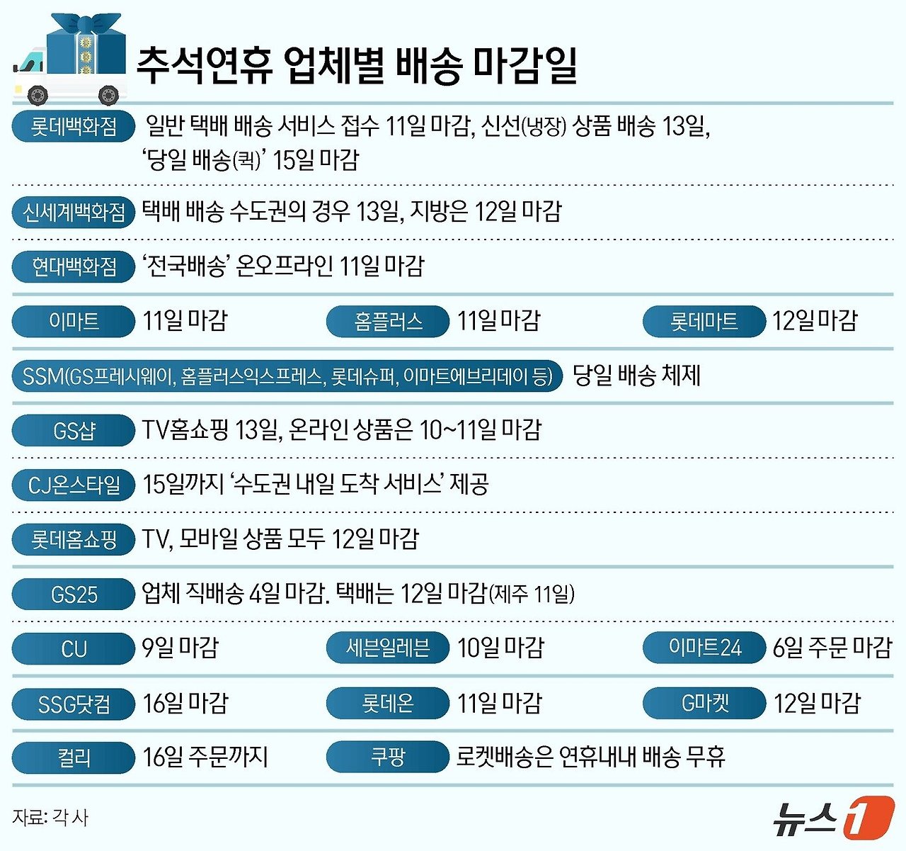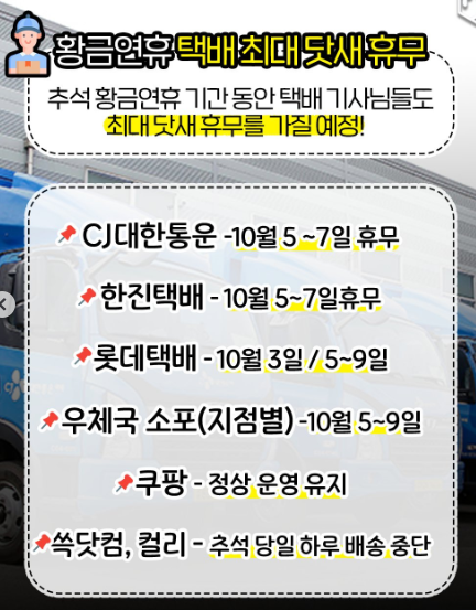 - 기타: 각 택배사별 상세 마감일은 이전 연휴의 사례를 참고하여 최소 1주일 전에는 접수하는 것이 안전합니다.