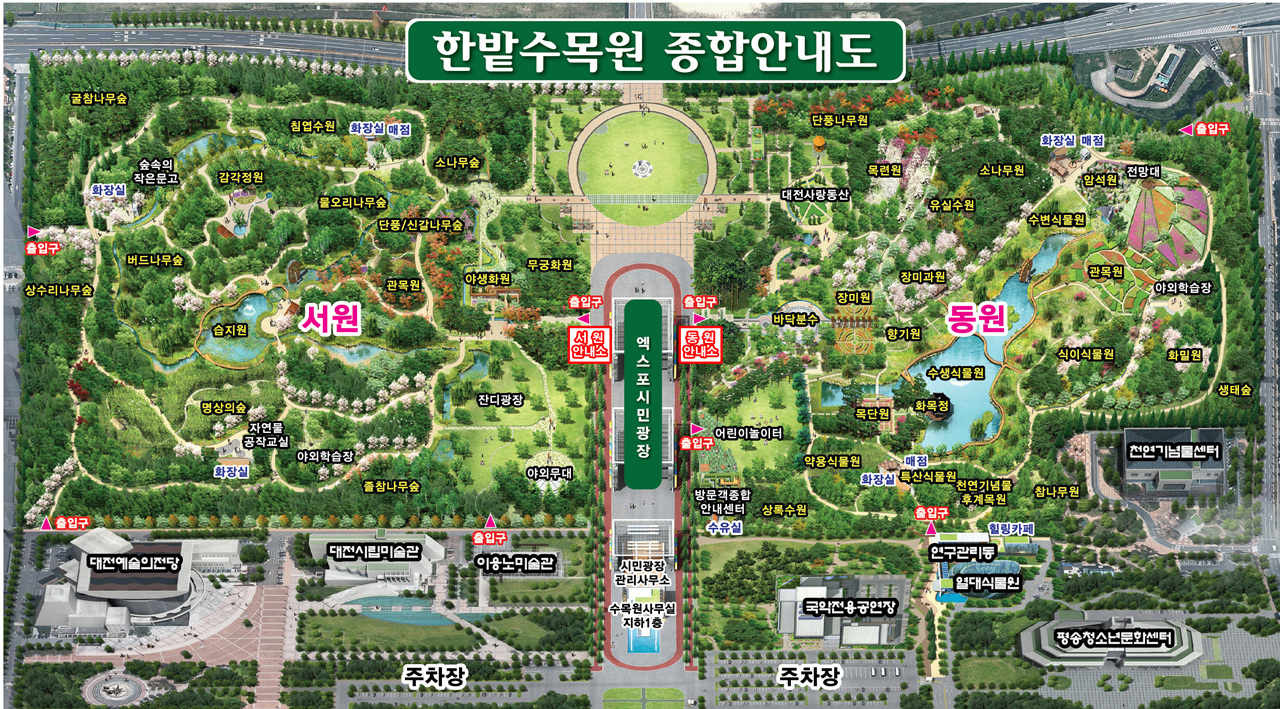 도심 속 푸른 휴식처인 한밭수목원은 동원, 서원, 열대식물원으로 구성되어 있습니다. 넓은 잔디밭과 다양한 식물들이 어우러져 있어 아이들이 마음껏 뛰어놀기 좋고, 자연을 관찰하며 생태 감수성을 기르기에도 좋습니다. 자전거를 타거나 피크닉을 즐기기에도 안성맞춤이며, 특히 봄에는 아름다운 꽃들이 만개하여 더욱 좋습니다.