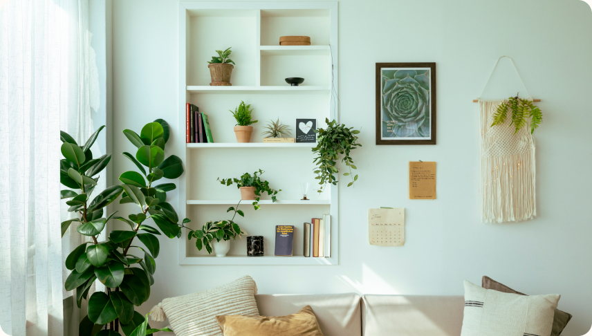 - 공간 점검: 빛(직사광선 vs. 간접광), 습도, 통풍 확인. 아파트처럼 빛이 부족한 곳은 음지 식물 선택. 협소한 공간이라면 행잉 플랜트나 벽 선반 활용으로 수직 공간 이용.