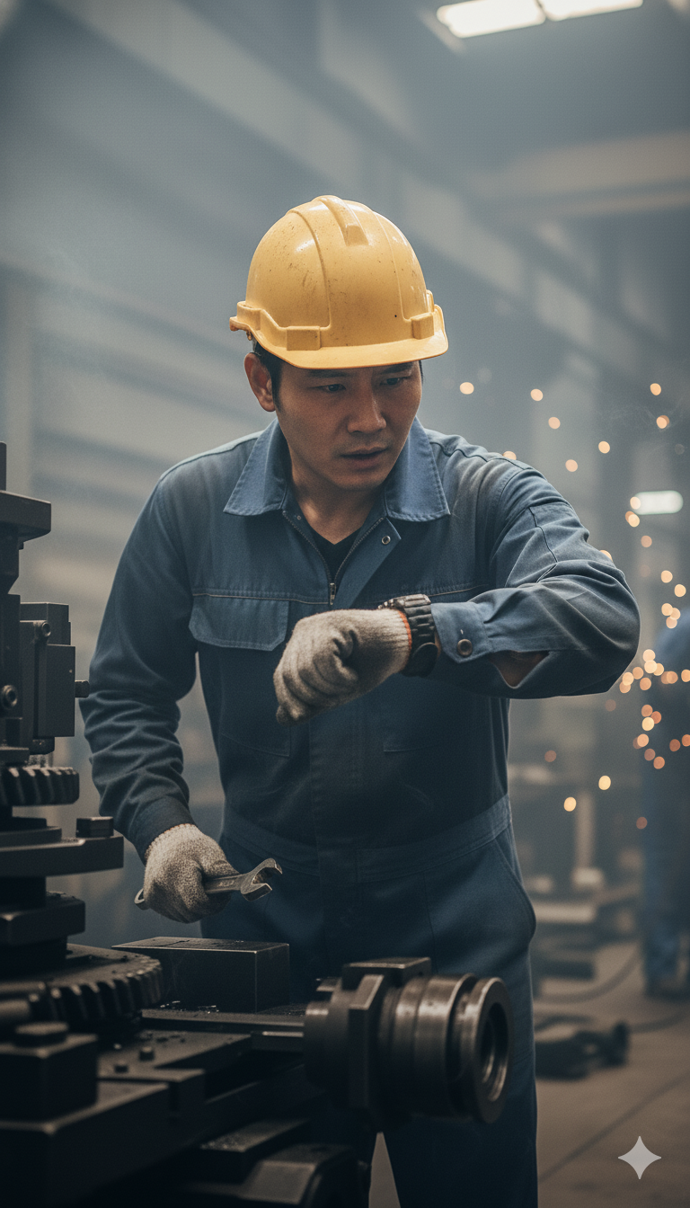 하루 종일 기계 앞에서 일하느라 기름때가 밴 손,