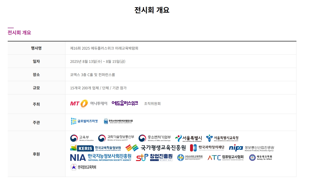한국을 선도하는 에듀테크 미래교육 전문행사로 전시회, 교원연수회, 국제컨퍼런스 등 다양한 프로그램이 동시에 진행됩니다. 2024년 기준 15회를 맞은 권위 있는 교육 분야 전시회입니다.