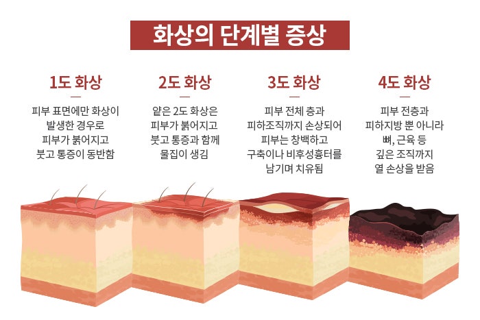 화상은 피부 손상 정도에 따라 1도, 2도, 3도 화상으로 나뉩니다.