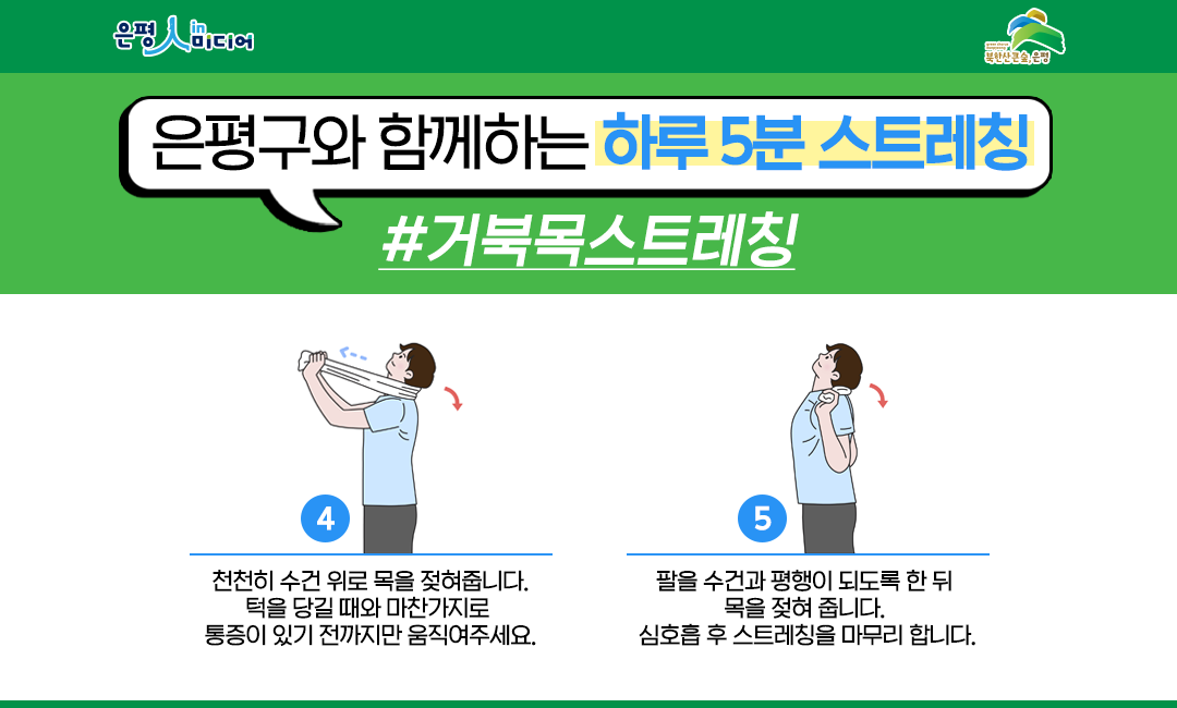 - 각 방향 3~5회 반복. (주의: 너무 빨리 돌리거나 과도하게 꺾지 마세요.)