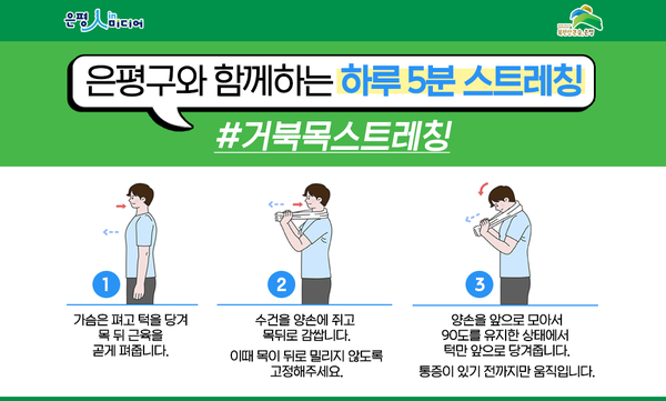 - 목 뒤쪽 근육이 늘어나는 것을 느끼며 15~20초 유지.