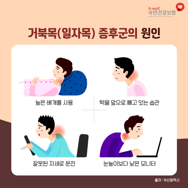 - 스마트폰/컴퓨터 사용 자세: 고개를 앞으로 숙이고 화면을 오랫동안 보는 자세가 가장 큰 원인입니다.