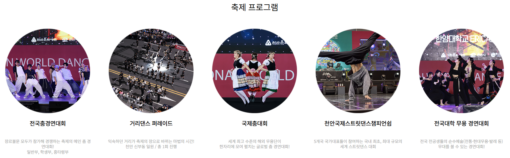 | 중간일 | 9월 25~27일 — 국제·국내 경연, 거리 퍼레이드, DANCEFLEX 등 |