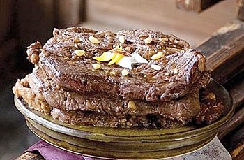 - 쇠고기 산적: 두툼한 산적용 쇠고기에 간장, 배, 양파, 마늘 등을 넣어 만든 양념에 재웁니다.