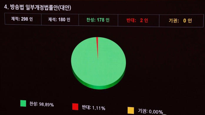 이번에 통과된 법은 방송3법과 방송통신위원회법을 포함한 “방송4법”이에요.