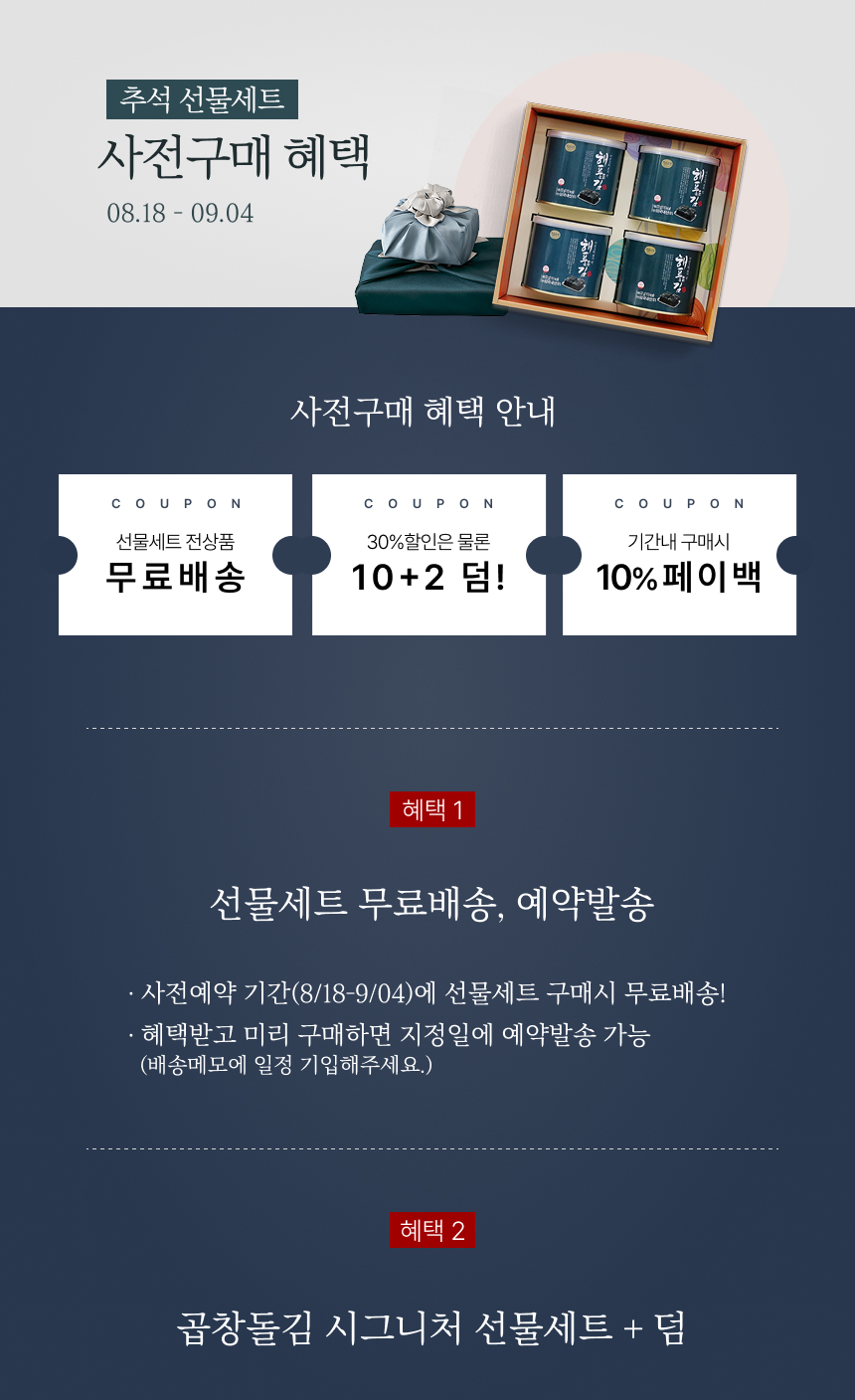 - 1+1/2+1 행사: 김, 햄, 식용유, 샴푸·바디세트 등 실속 선물세트 1+1 증정