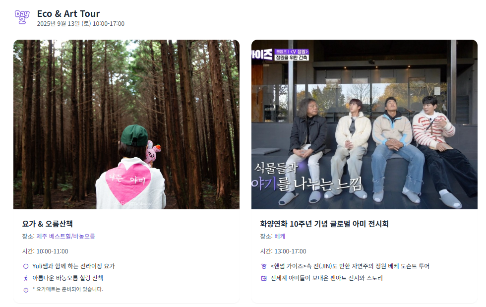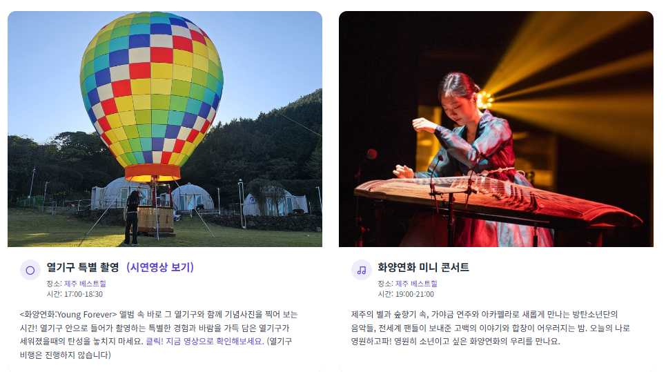 제주도의 보라색 꽃(메밀꽃, 핑크뮬리 등)을 테마로 한 자연축제입니다. 꽃밭 포토존, 자연 체험 프로그램, 제주 특산품 체험 등 힐링과 휴식을 위한 완벽한 축제입니다.