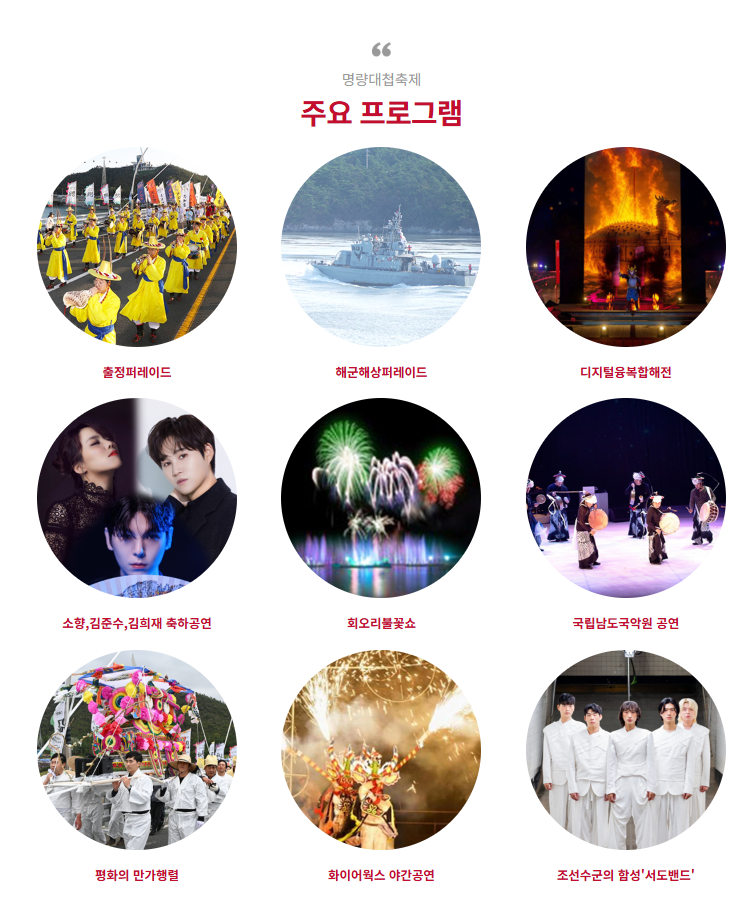이순신 장군의 명량대첩을 기념하는 역사축제입니다. 거북선 체험, 수군 재현행사, 해전 시뮬레이션, 전통 무예 시연 등으로 생생한 역사 교육의 장이 됩니다.