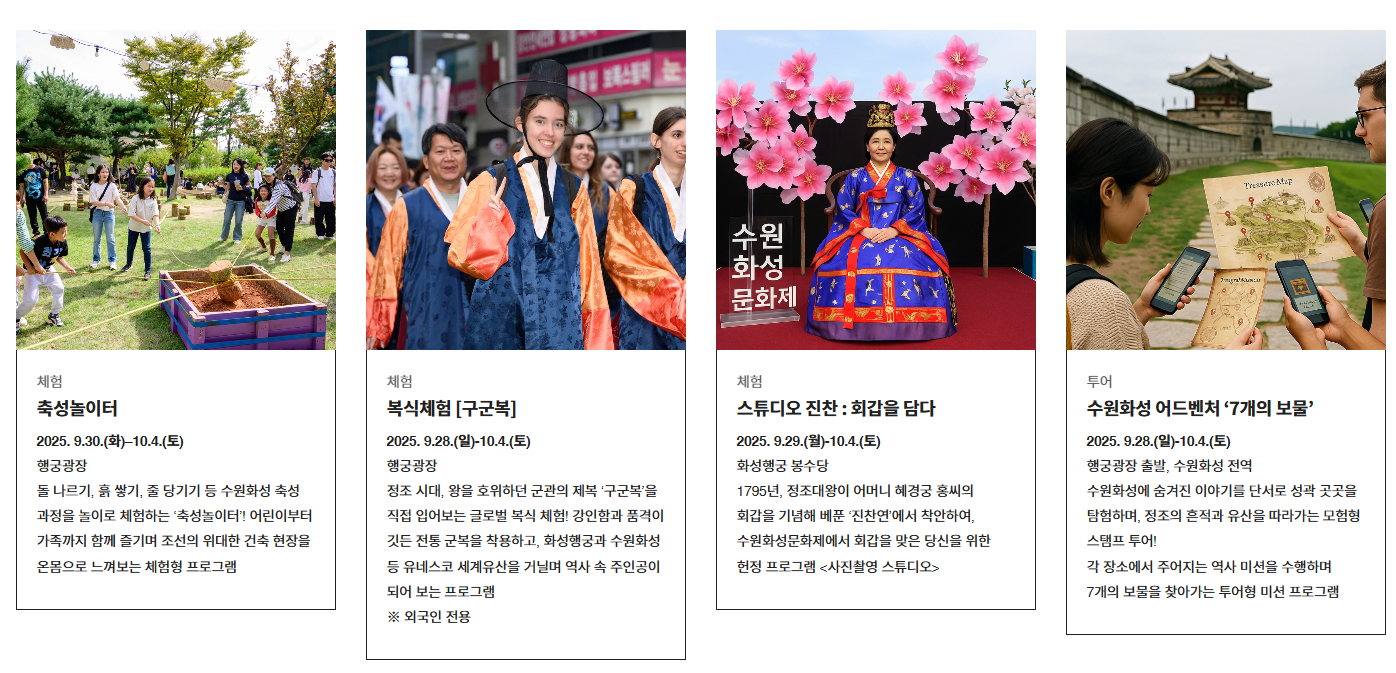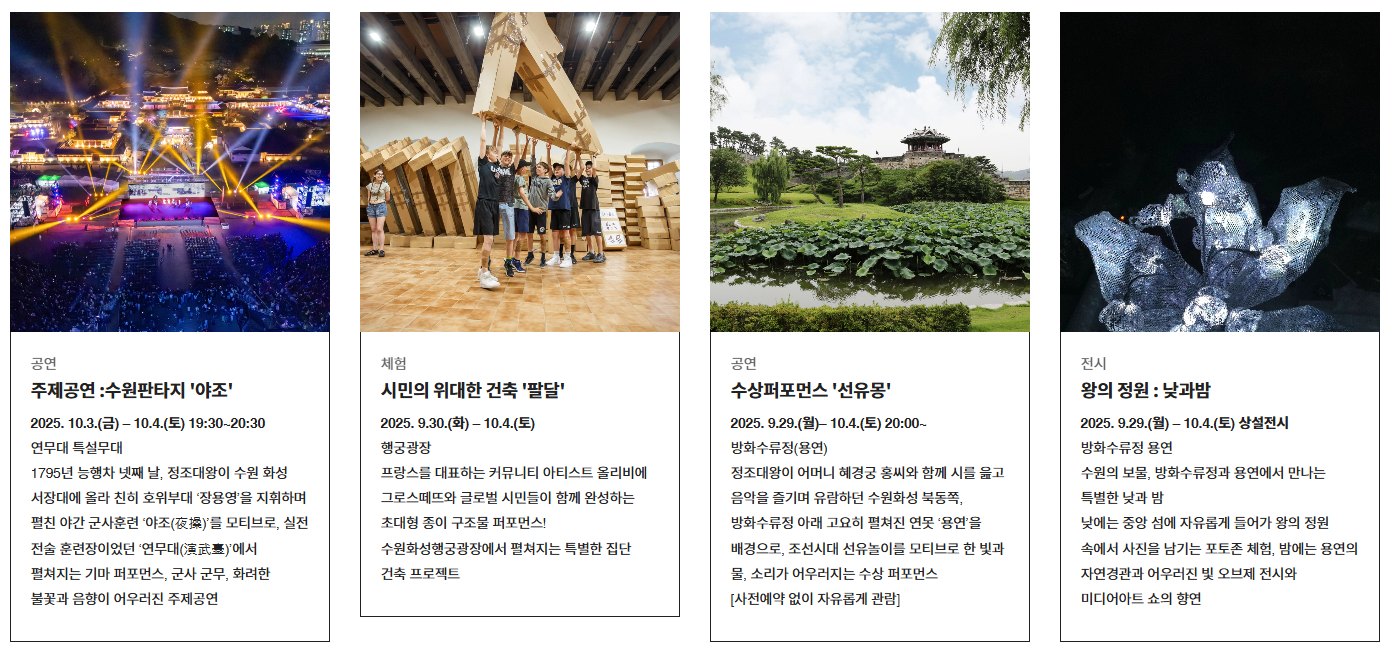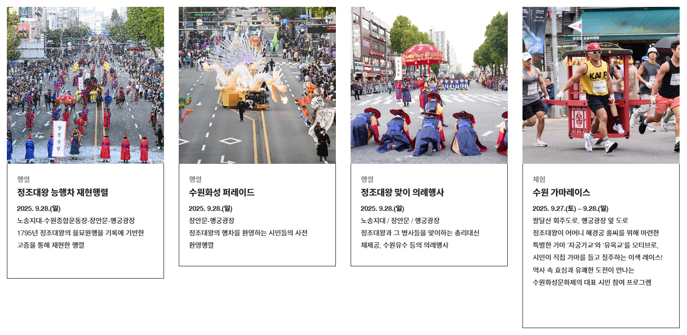 유네스코 세계문화유산인 화성을 배경으로 한 역사문화축제입니다. 정조대왕 능행차 재현, 전통무예 시연, 화성탐방 프로그램 등 조선시대 궁중문화를 생생하게 체험할 수 있습니다.