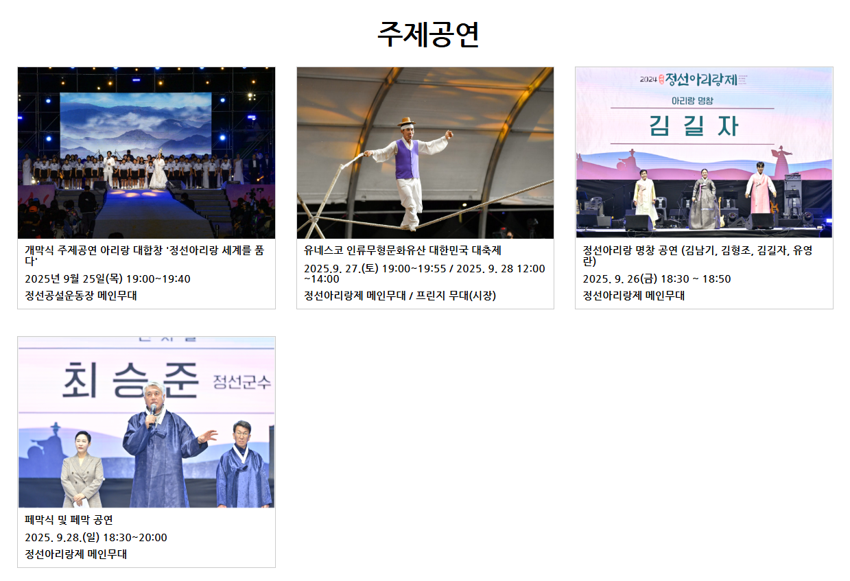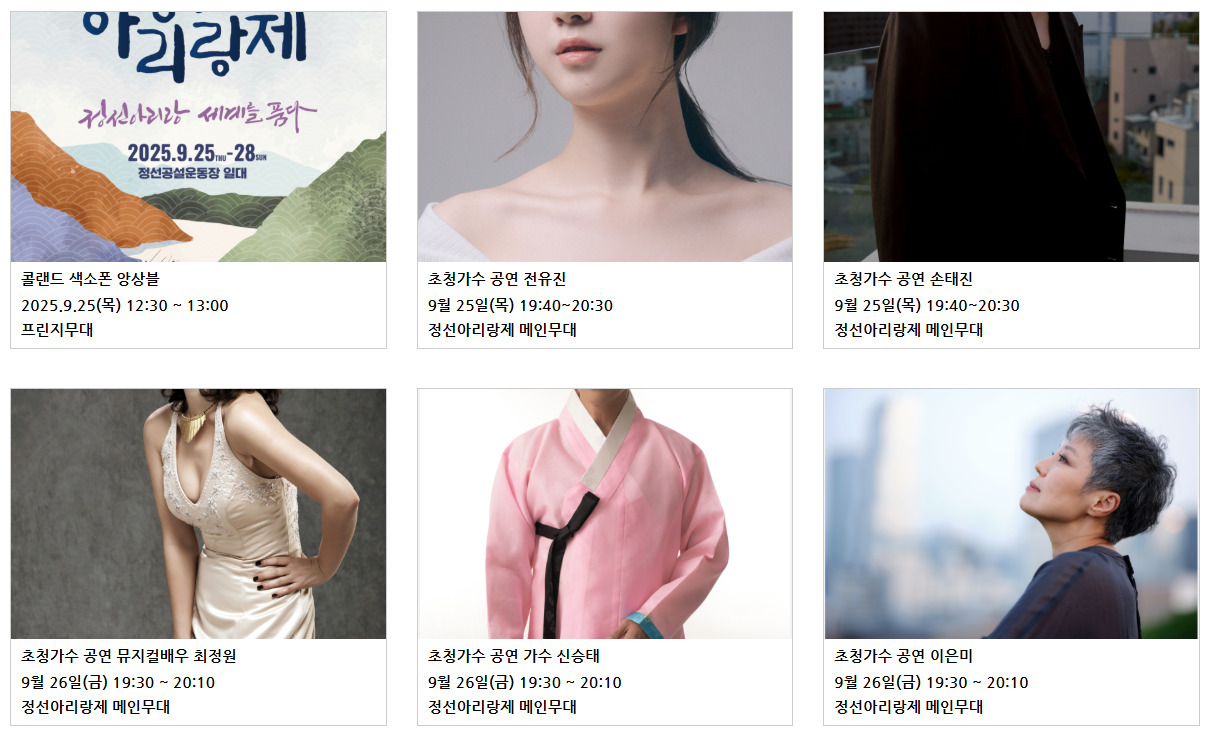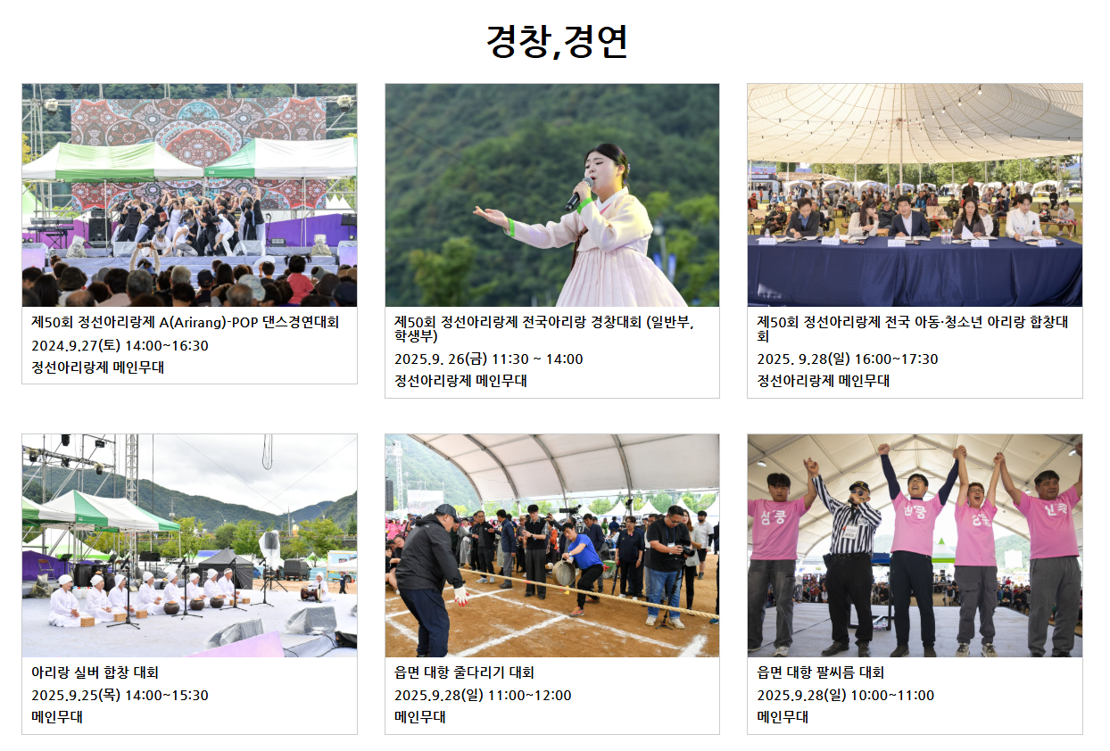 정선아리랑의 본고장에서 열리는 전통문화축제입니다. 아리랑 경창대회, 민요 경연대회, 전통놀이 체험, 지역 특산품 판매 등이 어우러져 한국의 정서를 만끽할 수 있습니다.