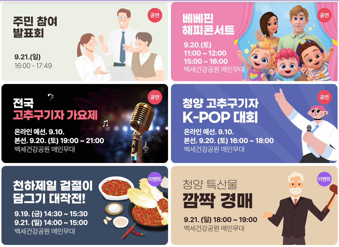 매년 8월말에서 9월초에 열리는 이 축제에서는 작은 마을 사람들의 축제를 향한 행복하고 강한 열정을 느낄 수 있습니다. 전국에서 가장 매운 고추로 유명한 청양고추와 슈퍼푸드로 각광받는 구기자를 주제로 한 이 축제는 단순한 농산물 축제를 넘어서 지역의 문화와 전통, 그리고 사람들의 따뜻한 정을 느낄 수 있는 특별한 행사입니다.