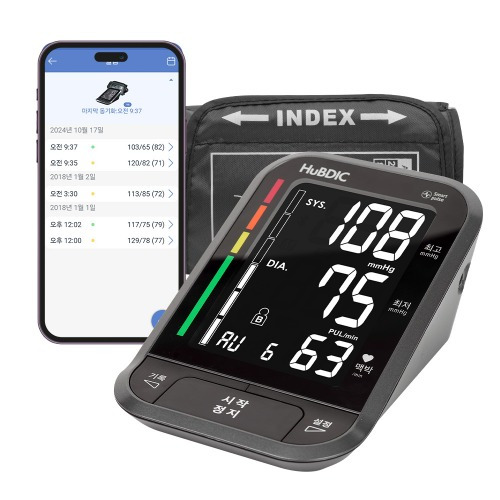 - 부가 기능: 불규칙 맥파 감지, 움직임 감지, 커프 착용 감지, 사용자 구분(다인용), 혈압 레벨 표시, 평균값 계산, 블루투스 연동(스마트폰 앱 연동) 등이 있습니다.