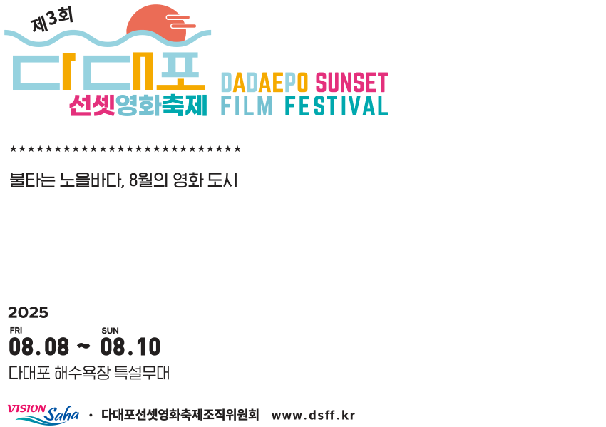 - 부산 다대포선셋영화축제 (부산 사하구 다대포해변): 8월 8일 (금) ~ 8월 10일 (일)