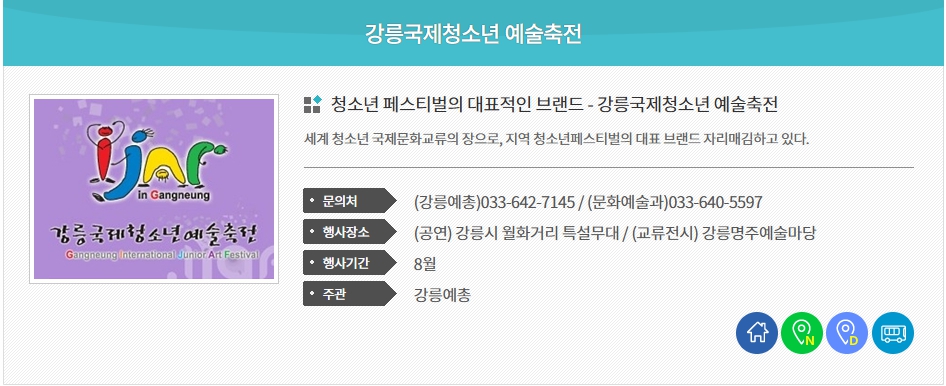 - 강릉국제청소년예술축전 (강릉시): 7월 30일 (수) ~ 8월 11일 (월)