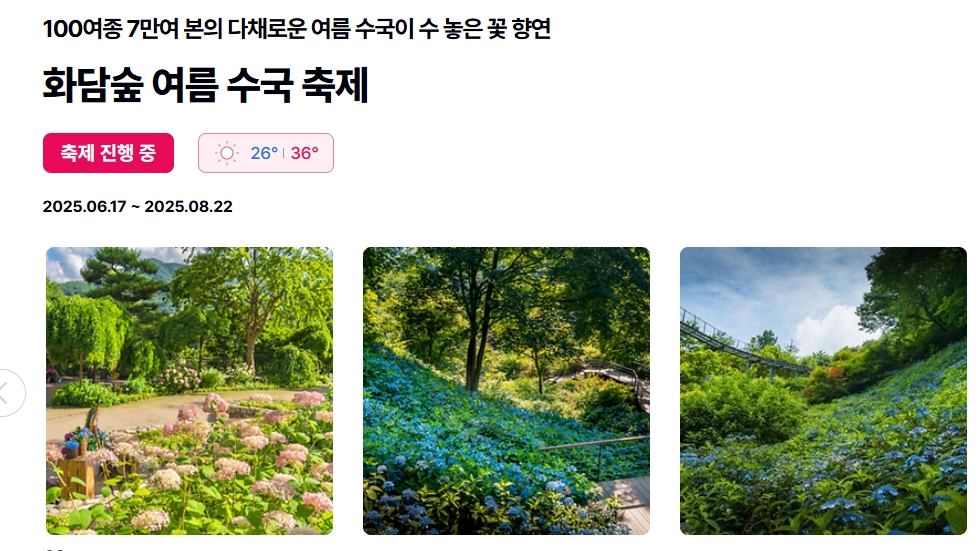 - 행사: 아름다운 수국이 만개한 화담숲에서 여름 꽃의 향연을 만끽할 수 있습니다. 숲 속을 거닐며 힐링하기 좋은 축제입니다.