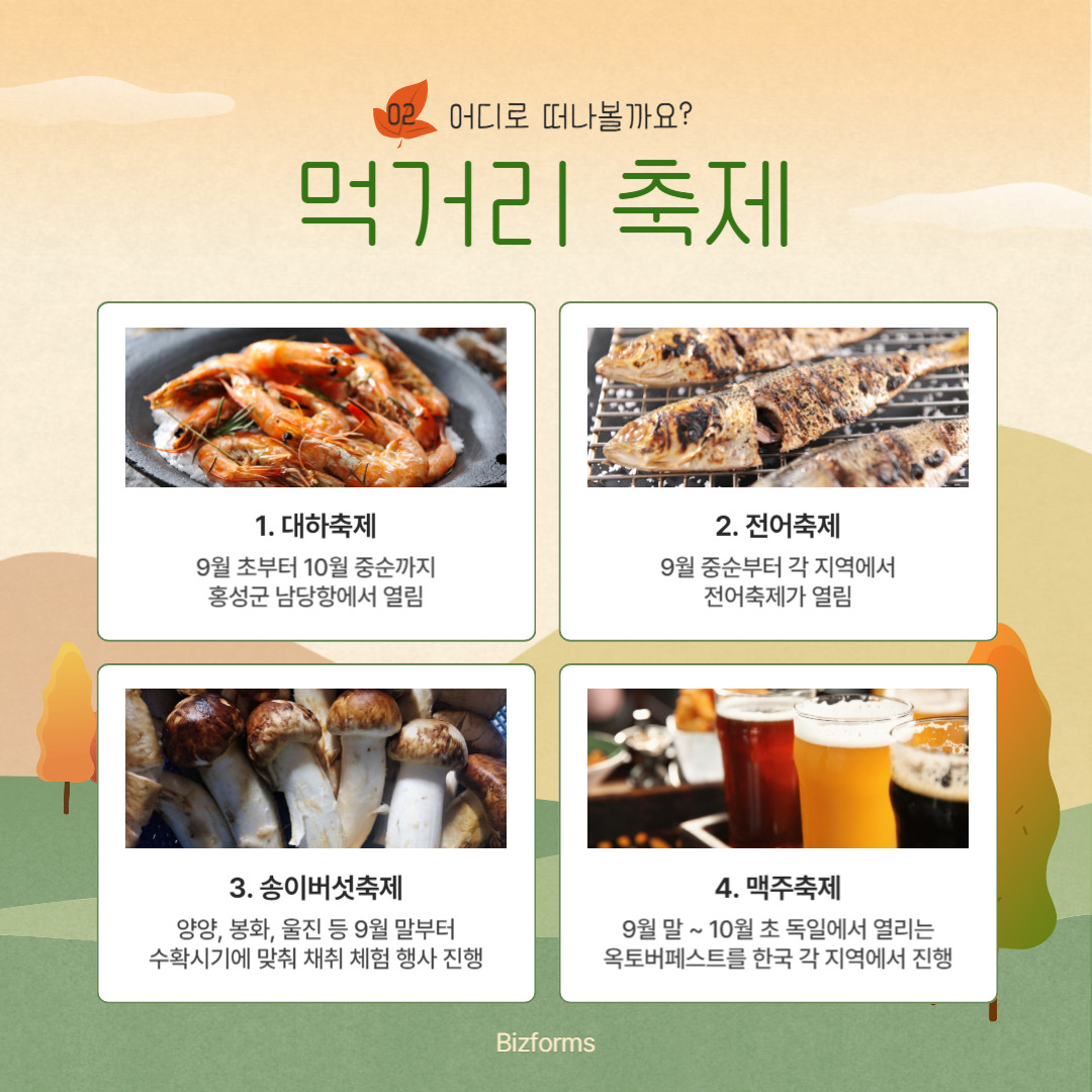 가을이 다가오면서 다양한 먹거리 축제가 열리는 9월이 돌아왔습니다. 이 시기에 맞춰 각 지역에서 열리는 축제들은 신선한 제철 음식을 맛볼 수 있는 좋은 기회를 제공합니다. 이번 포스팅에서는 9월에 가볼만한 먹거리 축제를 소개해 드리겠습니다.
