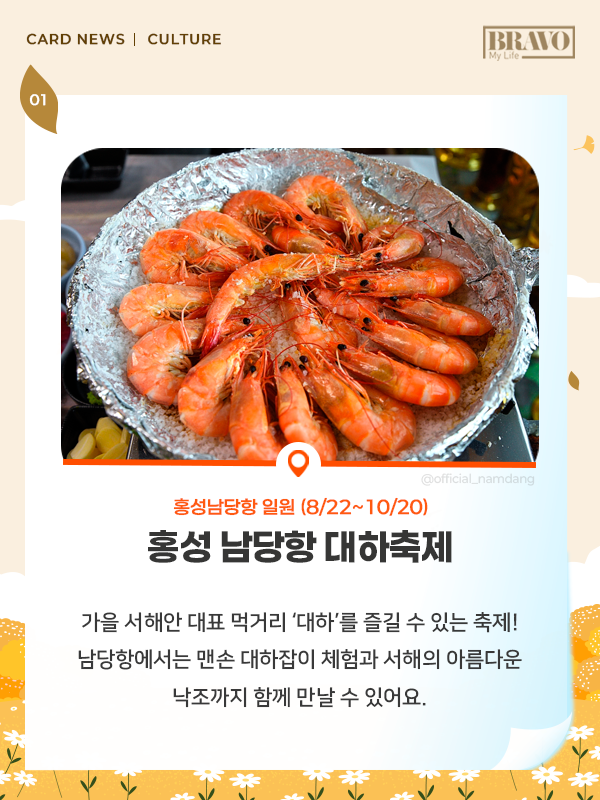 인천 소래포구에서는 바다 먹거리와 다양한 체험을 즐길 수 있는 가을여행 명소로 알려져 있습니다. 이 축제에서는 신선한 대하, 꽃게, 조개 등 다양한 해산물을 맛볼 수 있으며, 바다를 배경으로 한 다양한 공연과 체험 프로그램도 마련되어 있습니다. 가족과 함께 즐기기 좋은 축제로, 바다의 신선한 맛을 만끽할 수 있는 기회입니다.