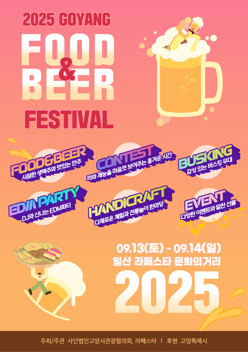 고양 푸드앤비어 페스티벌은 지역 먹거리와 맥주를 중심으로 가족·연인·친구가 함께 즐길 수 있는 야외 축제입니다. 공연과 참여형 체험, 지역 상권 연계 프로모션이 결합된 주민·관광형 복합 이벤트로, 입장 자체는 무료로 운영되는 경우가 많습니다.