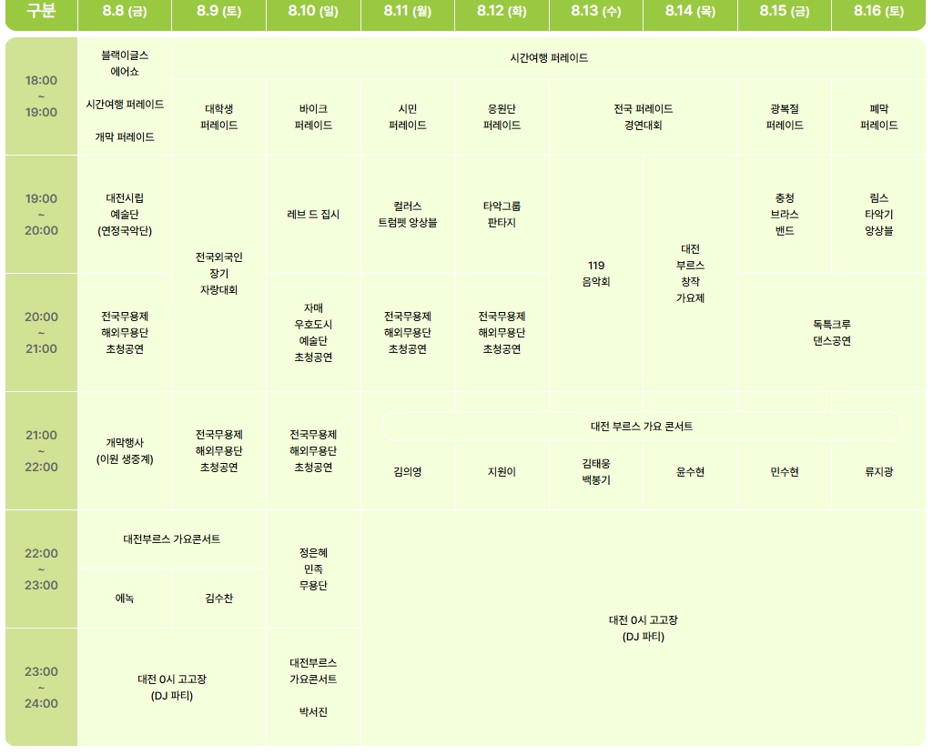 - 대전부르스 창작가요제: 8월 14일(목) 오후 7시~9시, 대전역 앞 야외무대