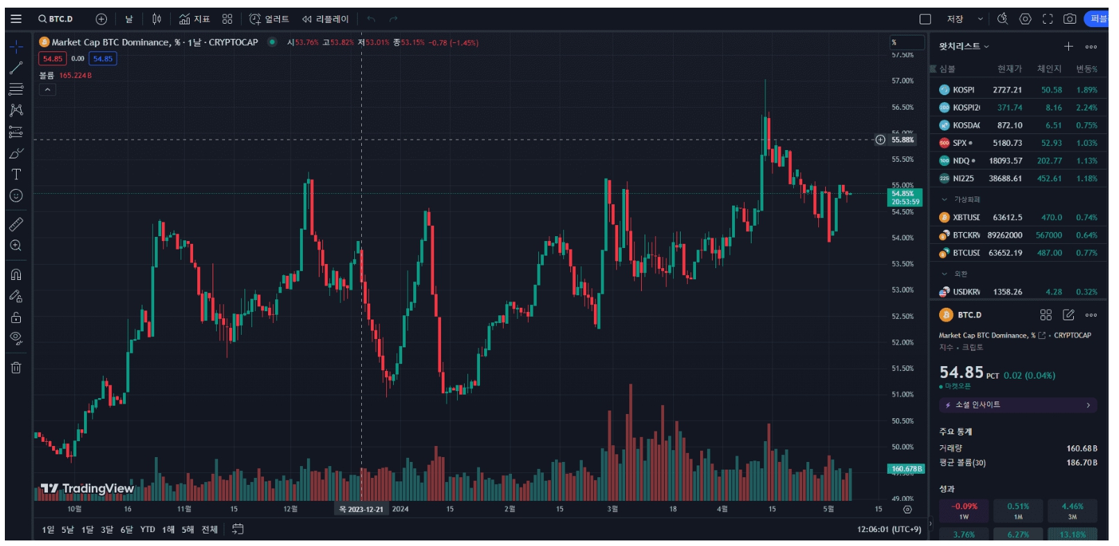 - 알트시즌 예측: 도미넌스가 50% 아래로 떨어지면 알트코인 급등 가능성이 높아집니다.