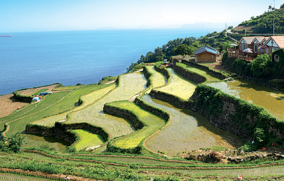 남해의 다랭이마을은 SNS 감성사진 좋아하는 분들에게 완전 추천이에요! 계단식 논 너머로 푸른 바다가 펼쳐진 모습이 정말 그림 같아요.
