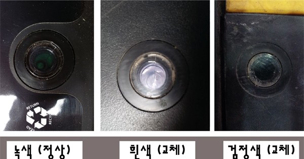 - 인디케이터 확인: 배터리 상단에 있는 인디케이터 색상을 확인합니다. 초록색이면 정상, 검은색이면 충전이 필요, 흰색이면 교체가 필요합니다. (배터리 종류에 따라 인디케이터가 없을 수 있습니다.)