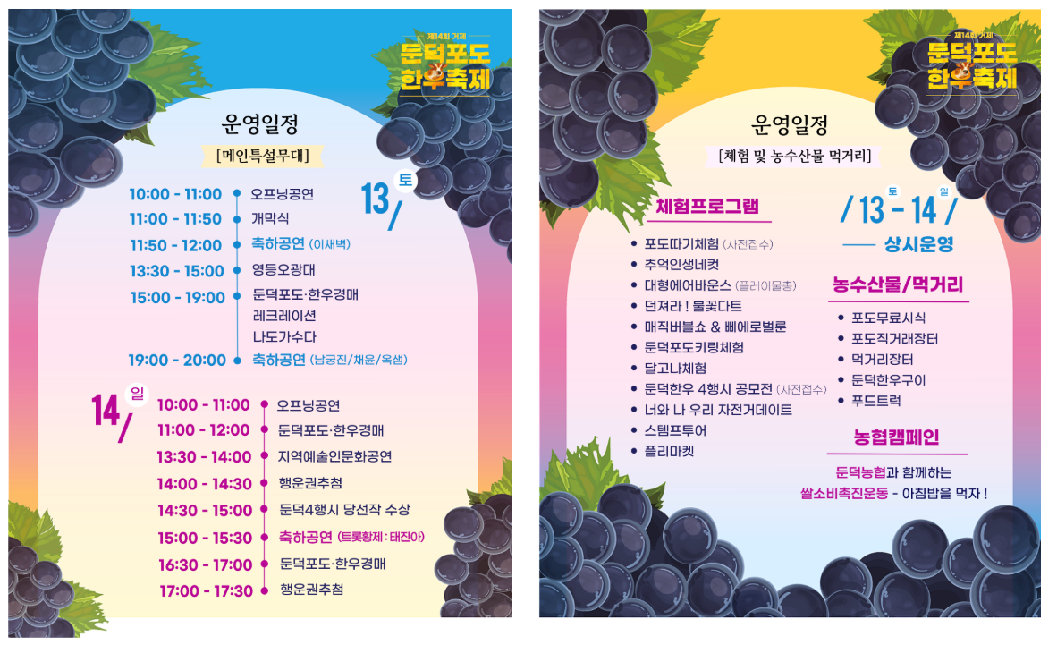 - 농·특산물 판매관: 둔덕포도, 둔덕한우 등 지역 대표 먹거리 판매