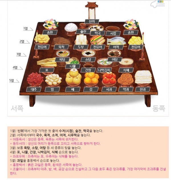 | 5열 | 과일 및 한과 | 조율이시 (왼쪽부터 대추, 밤, 배, 감 순서) 홍동백서 (붉은 과일은 동쪽, 흰 과일은 서쪽) |